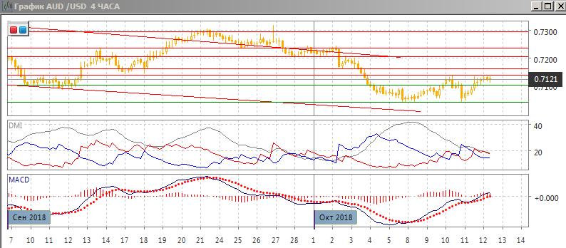 На дневном графике пара получила поддержку на предыдущем минимуме, после чего закрытие было выше 0,7100 и близкого минимума сентября. Так как ранее образовалось бычье расхождение минимумов пары и гистограммы MACD, также бычье расхождение по RSI, текущий отскок может продолжиться. Пока, однако, разворота не произошло, и пара остаётся в нисходящем канале с июня. По индикаторам направленного движения тенденция снижения сохраняется — DM- выше DM+, гистограмма MACD остаётся в отрицательной зоне, линия MACD имеет отрицательный наклон.