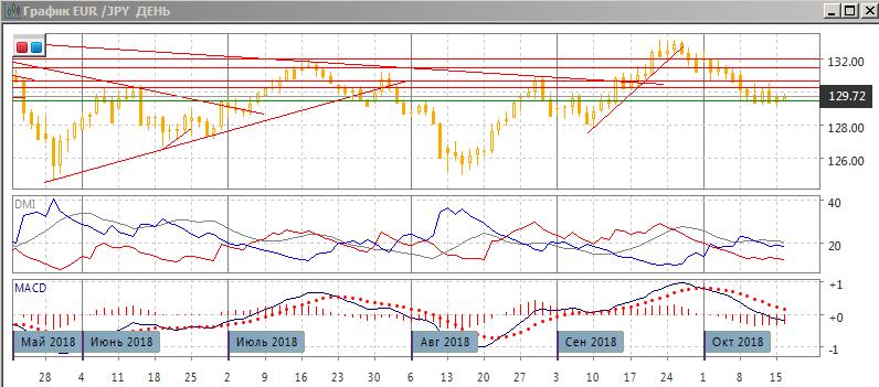 На четырёхчасовом графике пара выросла до 130 после образования бычьего расхождения минимумов пары и гистограммы MACD у 129,15, однако пока не привело к развороту тенденции. Относительные минимумы и максимумы пары пока снижаются. Если пара движется в диапазоне, то целью может быть рост до верхней границы диапазона у 130,50 (максимумы 9 и 11 октября). Но если пара снизится от текущего уровня у 129,80 (около середины диапазона) к нижней границе на 129,15, то более вероятным будет выход из диапазона вниз.
