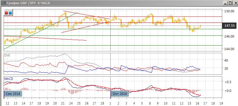 Пара перешла к снижению после консолидации 147-149, как как был преодолён нижний уровень. Пара восстановилась и вернулась выше уровня 147,00, однако относительные максимумы и минимумы пары с 9 октября последовательно снижаются. Текущий отскок вверх остаётся в пределах коррекции к снижению от 149,00. DM- остаётся выше DM+. Более вероятным кажется возобновление снижения с ближайшей целью на точке начала отскока 146,50.