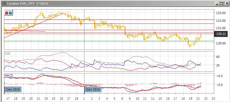 На четырёхчасовом графике пара вернулась в диапазон и остаётся в нём в начале понедельника. В раках движения в диапазоне ближайшая цель — сопротивление на 130,25 и далее 130,65. Относительные максимумы и минимумы пары сейчас последовательно растут. По индикаторам направленного движения в целом остаётся флэт: DM+ и DM- близки, более краткосрочной тенденцией является рост: гистограмма MACD растёт уже в положительной зоне, линия MACD имеет положительный наклон.