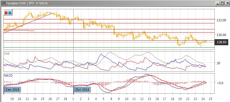 На четырёхчасовом графике образовалось двойное дно у 128,25, при этом образовалось бычье расхождение минимумов пары и гистограммы MACD, а также расхождение по RSI. Преодоление после этого уровня 129,15, если оно произойдёт (пара тестировала уровень в начале среды) предполагает возможность продолжения роста до 130,00, где будет следующий сильный уровень сопротивления. Пока пара не преодолена уровень 129,15, высока вероятность отката вниз к минимумам на 128,25. По ADX тенденции сейчас нет.
