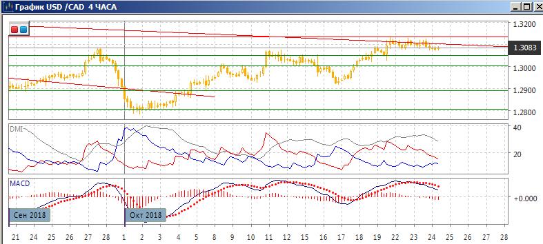 На четырёхчасовом графике коррекция к снижению: пара после консолидации в узком диапазоне 1,3080-1,3135 находится сейчас около нижней его границы, где образуются свечи «дожи». По индикаторам направленного движения коррекция к росту: по ADX тенденция роста сохраняется, превышение DM+ над DM- остаётся, коррекционное движение видно по снижению гистограммы MACD и отрицательному наклону линии MACD. Также пара остаётся ниже линии более долгосрочного тренда. Это делает более вероятным краткосрочное снижение даже в рамках коррекции. Сигнализировать о возобновлении роста может преодоление сопротивления на 1,3135.