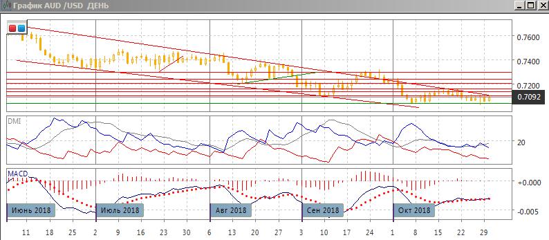 На четырёхчасовом графике пара находится у верней границы канала с июня разворота не было, но преодоление 0,710 может изменить картину. Ранее и на этом масштабе образовалось бычье расхождение минимумов пары и гистограммы MACD. Преодоление уровня 0,7100 сделало бы следующей целью максимумы середины октября на 0,7160. Закрепление выше верхней границы канала также может привести к более значительному росту. В рамках движения в канале пара снижалась бы от 0,7100.