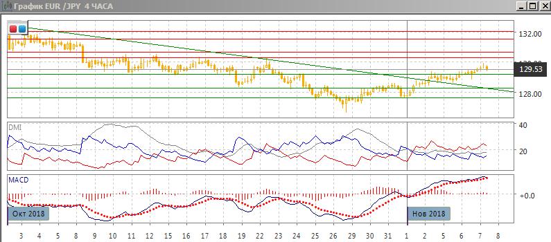 На четырёхчасовом графике пара преодолела уровень 129,20, ниже которого была консолидация 2-5 ноября. 6 октября этот уровень выступил уже поддержкой для пары. Последовательность роста относительных максимумов и минимумов пары сохраняется. Медвежье расхождение максимумов пары и гистограммы MACD увеличивает вероятность отката, при этом поддержки можно ожидать на уровне 129,20.