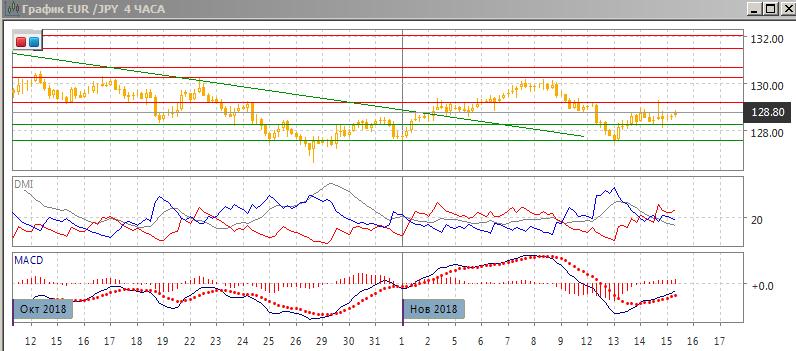 На дневном графике пара получила поддержку на уровне 127,60, это поддержка в конце октября. Отскок ограничился на уровне 129,20 (поддержка в середине октября), ниже этого уровня образовалась «падающая звезда», при подтверждении снижением в четверг пара скорее возобновляет снижение с новым тестированием уровня 127,60. По ADX тенденцией остаётся снижение — DM- выше DM+. Пара остаётся ниже 200-дневной средней (около 130,00).