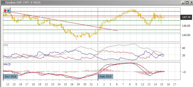 На четырёхчасовом графике пара в консолидации ниже 148,00. Диапазон консолидации сейчас 147,00-148,00. Пара, скорее, будет двигаться в направлении выхода из этой консолидации. По индикаторам направленного движения в этом масштабе флэт: DM- и DM+ близки, гистограмма MACD около нуля, линия MACD почти горизонтальна. Краткосрочно пара имеет поддержку на 20-периодной средней в верхней полосе Боллинджера, исходя из этого пара пара скорее достигнет недавних максимумов около 148,35.