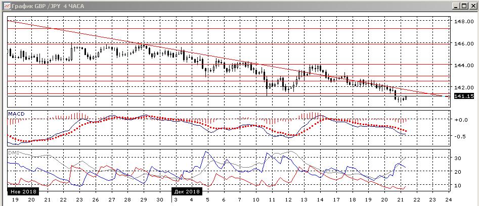 На дневном графике остаётся ниже нисходящей линии тренда с начала ноября. Также сохраняется последовательность снижения относительных максимумов и минимумов пары от 149,50. Вблизи обоснованной поддержки не видно до минимума августа около 140,00, сейчас он кажется целью снижения. По ADX снижение является сильной тенденцией: превышение DM- над DM+ большое и увеличивается, ADX на относительно высоком уровне и растёт. Гистограмма MACD остаётся в отрицательной зоне, хотя образовалось бычье расхождение минимумов пары (этот сигнал не имеет подтверждения).
