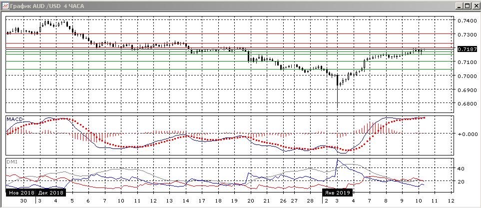 На четырёхчасовом графике рост замедляется, в этом масштабе образовалось медвежье расхождение максимумов пары и гистограммы MACD, и возвращение пары ниже уровня поддержки на 0,7150 может быть сигналом разворота в краткосрочной перспективе (поддержка в середине декабря и сопротивления в начале января). В начале 10 января этот уровень уже выступил поддержкой, после того, как этот уровень был преодолён 9 января. Дальнейший рост возможен при закреплении выше 0,7200, сопротивление на этом уровне сильное и есть большой риск отката от этого уровня.
