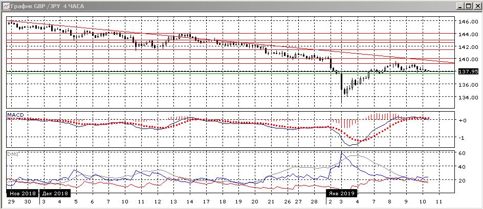 На четырёхчасовом графике пара разворачивается6 последний максимум был ниже предыдущего, пара тестирует уровень предыдущего минимума 8 января у уровня 138,00. Закрепление ниже этого уровня скорее стало бы сигналом разворота и завершения коррекции вверх. По индикаторам направленного движения тенденцией становится снижение: DM- выше DM+, гистограмма MACD переходит в отрицательную зону, линия MACD разворачивается. Скорее, сейчас надо подождать закрепления ниже 138,00, и если это произойдёт, рассчитывать на снижение в краткосрочной перспективе.