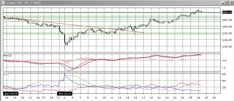 На дневном графике закрытие в пятницу было выше уровня сопротивления на 144,00 (минимум в середине ноября и относительный максимум в середине декабря). Следующий обоснованный уровень — 146,00, у максимумов конца августа и конца ноября. Волна роста без существенных откатов уже очень велика — 1200 пунктов. Это очень много и откат неизбежно приближается, рассчитывать на дальнейший существенный рост с текущего уровня в краткосрочной перспективе уже рискованно. По индикаторам направленного движения, однако, пара уже перешла к росту: DM+ сейчас выше DM-, ADX остаётся на высоком уровне, гистограмма MACD растёт в положительной зоне, линия MACD сохраняет положительный наклон.
