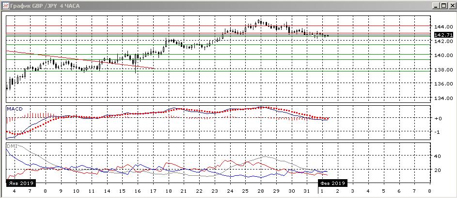 На четырёхчасовом графике пара последовательно снижается, относительные максимумы и минимумы пары снижаются от 145,00. Однако видно, что снижение замедляется: образуется больше свечей близких к «дожи», образовалась бычье расхождение минимумов пары и гистограммы MACD. Замедление снижения происходит при приближении к уровню 142 (максимум середины января, а также важная поддержка в декабре). По ADX тенденция снижения сейчас слабая – ADX на низком уровне. Исходя из этого, до преодоления 142,00 отскок в краткосрочной перспективе кажется более вероятным.