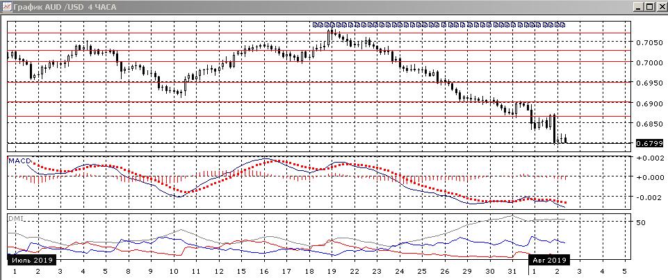 На четырёхчасовом графике продолжается последовательное снижение, уровень нижней границы диапазона, из которого пара вышла, 0,6865,выступил уже сопротивлением при отскоке вверх 1 августа. По ADX тенденция снижения остаётся сильной: превышение DM- над DM+ большое и устойчивое. Однако даже при резком снижении 1 августа образовалось бычье расхождение минимумов пары и гистограммы MACD, что увеличивает вероятность отскока вверх.