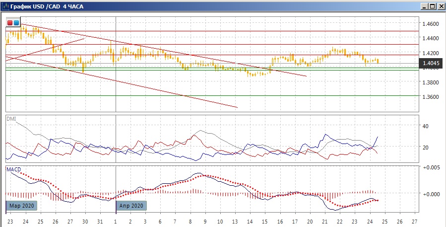 На дневном графике пара вернулась ниже уровня сопротивления 1,4155. Рядом сильная поддержка на 1,4000. Вероятно, дальнейшая перспектива будет определяться устойчивостью этого психологически важного уровня. Пока пара выше, вероятным видится возобновление роста. Если будет закрытие ниже, то кроме преодоления важного уровня, это станет также нарушением последовательности роста относительных максимумов и минимумов пары.
