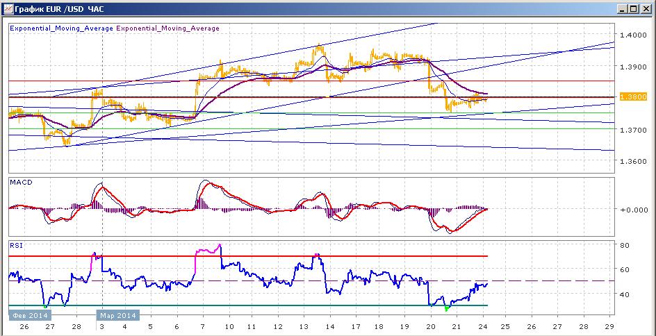 прекратившийся рост пары с 14 марта — пара уперлась в сопротивление на 1.3940 — завершился вчера ближе к концу сессии. Пара одним движением упала ниже 1.3850, достигнув 2-недельных минимумов и выйдя вниз из восходящего канала. сегодняшние торги проходят с небольшим ростом. Средние скользящие ЕМА21 и ЕМА55 направлены вверх, но пересеклись вниз и начали снижаться. Индикаторы MACD и RSI вчера ушли ниже центральных линий и сегодня растут. Сегодня цели вверх — 1.3850, 1.3900. Цели вниз на сегодня — 1.3800, 1.3750