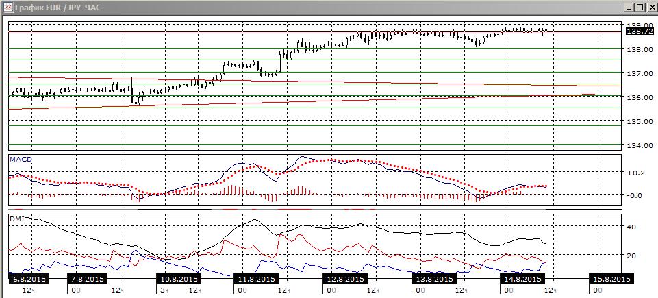 На четырёхчасовом графике может образоваться двойная вершина, если пара второй раз снизится после приближения к 139,00. Образовалось медвежье расхождение максимов пары и гистограммы MACD. Снижение от 139,00 развития не получило, и пока разворота нет — относительные минимумы пары растут. Тем не менее, при расчёте на продолжение роста стоит дождаться закрепления выше 139,00. По ADX рост остаётся сильной тенденцией — превышение DM+ над DM- большое.