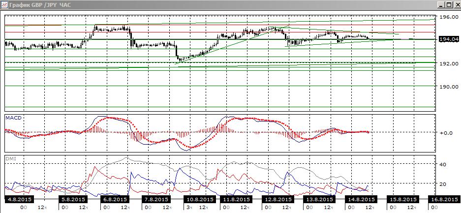 На четырёхчасовом графике явной тенденции нет: если рассматривать движение как движение в восходящем канале, то более вероятно снижение до 192,00 — около нижней границы канала. По индикаторам направленного движения также флэт: DM+ и DM- близки, гистограмма MACD около нуля, линия MACD почти горизонтальна.