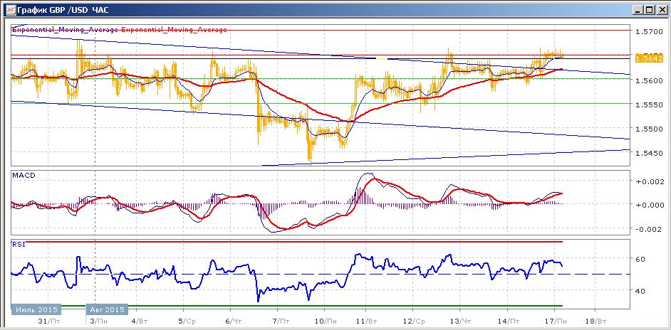 пара продолжает медленно расти с 7 августа. В четверг пара закрылась с небольшим снижением, оставшись выше 1.5600. в пятницу пара росла и после неоднократно теста поддержки на 1.5600, пара в итоге закрылась с ростом выше 1.5650. сегодняшние торги проходят с небольшим снижением пары, которая снова ушла ниже 1.5650.Средние скользящие ЕМА55 и ЕМА22 направлены вверх и растут. Индикаторы MACD и RSI с пятницы находятся выше своих центральных линий и сегодня слабо снижаются. Сегодня цели вверх — 1.5650, 1.5700. Цели вниз — 1.5600, 1.5550