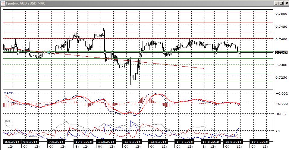 На четырёхчасовом и часовом графиках пара находится в горизонтальном канале 0,7350-0,7400, сейчас пара достигла нижней границы канала. Исходя из движения в канале, стоит ожидать рост пары до верхней границы. Однако последние несколько относительных максимумов не достигали 0,7400, и учитывая тестирование нижней границы канала, выход из него вниз кажется более вероятным в ближайшей перспективе. Дальнейшее напрваление, вероятно, определится при выходе пары из канала — пока этого не случилось. По индикаторам направленного движения на четырёхчасовом графике флэт. Исходя из ширины канала, целью при выходе будет движение в размере 50 пунктов.