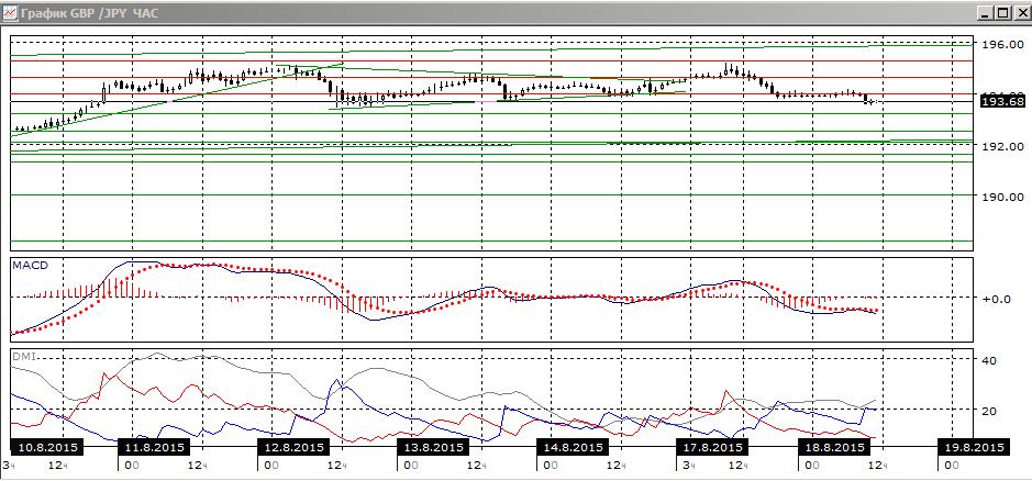 На четырёхчасовом графике подобная картина, пара снижается в растущем канале. Сопротивление на 195,25 можно считать укрепившимся — там было три вершины. После снижения ниже 194,00 этот уровень вновь выступает сопротивлением. Учитывая, что пара закрепилась ниже 194,00, более вероятно что снижение продолжится. По индикаторам направленного движение явной тенденции нет, немного предпочтительнее видится снижение (DM- немного выше DM+, линия MACD имеет отрицательный наклон), но тенденция слабая. Ближайший сильный уровень поддержки — на 193,20.