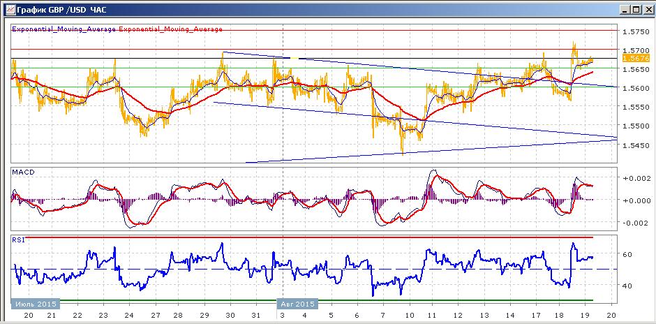 пара продолжает медленно расти с 10 августа. В понедельник пара не смогла закрепиться выше 1.5650, после чего начала снижаться, закрывшись в итоге ниже 1.5600. вчера о второй половине торгов пара резко подросла, протестировала сопротивление на 1.5700, показав максимум выше 1.5700 с 1 августа, но закрылась пара на 1.5660. Средние скользящие ЕМА55 и ЕМА22 направлены вверх и растут. Индикаторы MACD и RSI вчера вышли выше своих центральных линий и сегодня слабо снижаются. Сегодня цели вверх — 1.5700, 1.5700. Цели вниз — 1.5650, 1.5600