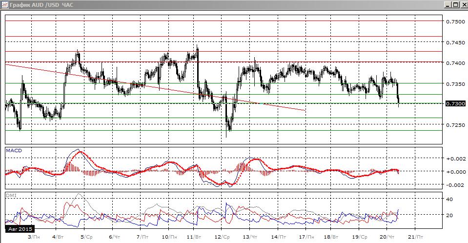 На четырёхчасовом и часовом графиках пара постепенно снижается, но в целом не выходит за уровни, определившиеся ранее — 0,73 и 0,74. На часовом графике флэт, пара в четвёртый раз приближается к 0,7320 (уровень поддержки также 6 и 13 августа и сопротивления 12 августа) и получает поддержку на этом уровне. При преодолении этого уровня целью видится снижение до 0,7265, так как пара выйдет из краткосрочного канала. Это вероятно, так как если краткосрочным каналом рассматривать 0,7320-0,7400 консолидация идёт у нижней границы.