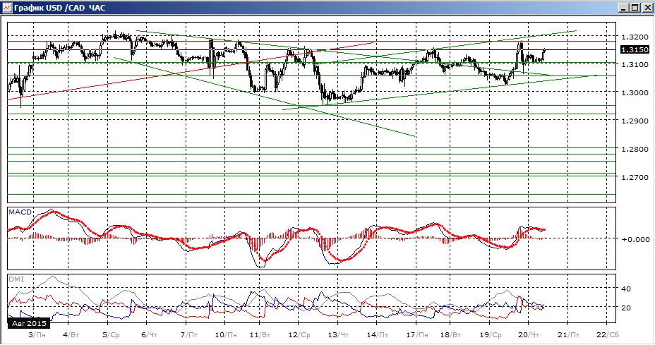 На часовом графике пара растёт, можно рассматривать восходящий канал с 12 августа. Снижение после приближения к верхней границе остановилось на 1,3100, снижение от 1,3180 можно рассматривать как коррекционное к росту пары от 1,3030. По индикаторам направленного движения - флэт. Исходя из того, что тенденция роста целом сохраняется, более вероятно его преодоление с целью на 1,3200.