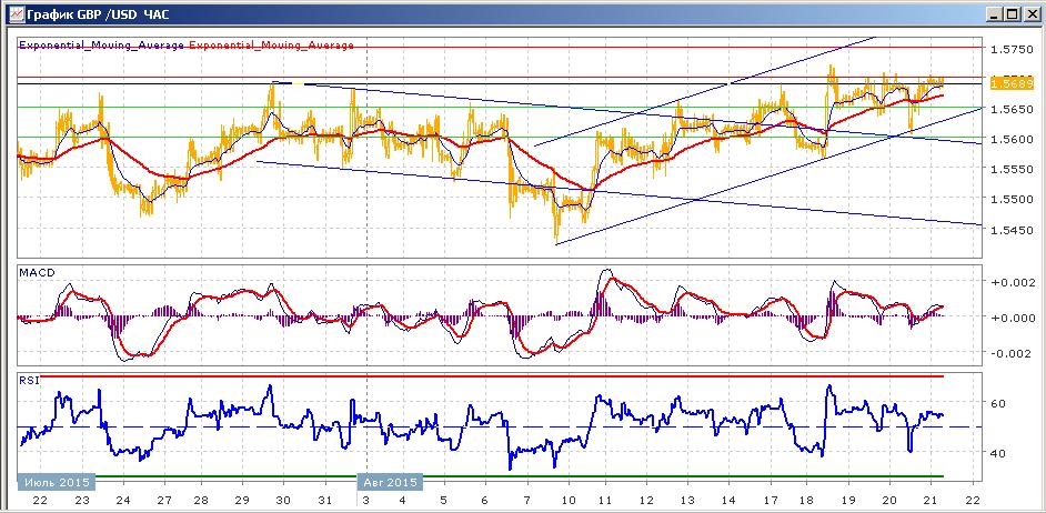 пара продолжает медленно расти с 10 августа в рамках образовавшегося восходящего канала. При этом со вторника сопротивление уровня 1.5700 сдерживает пару. В среду пара закрылась с небольшим ростом ниже 1.5700. вчера пара закрылась также с условным ростом, хотя в середине торгов почти достигла 1.5600. сегодняшние торги проходят на уровне открытия на 1.5690. Средние скользящие ЕМА55 и ЕМА22 направлены вверх и растут. Индикаторы MACD и RSI вчера вышли выше своих центральных линий и сегодня слабо растут. Сегодня цели вверх — 1.5700, 1.5700. Цели вниз — 1.5650, 1.5600