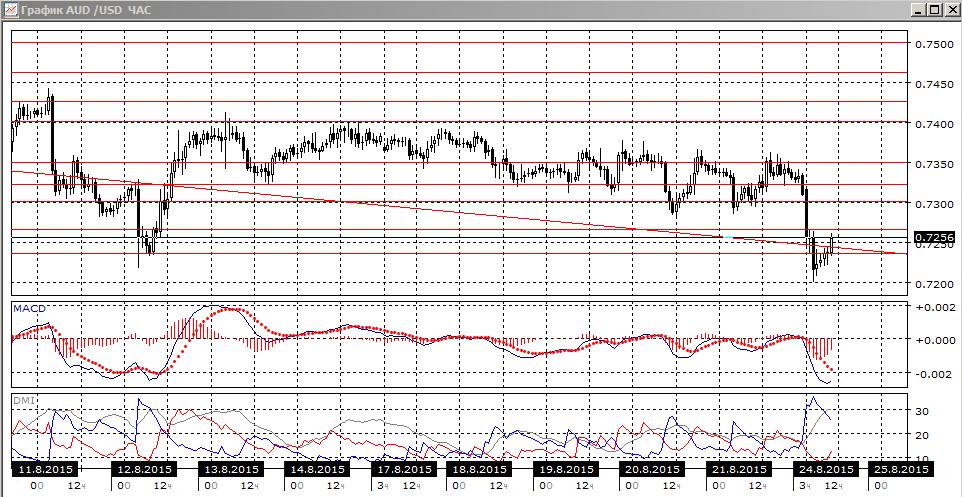 На дневном графике пара резко снизилась после того, как на уровне 0,7350 была задержка. Пара достигла нового минимума в 0,7200. Если закрытие будет ниже уровня поддержки на 0,7265 и тем более 0,7235, то это будет закрытием и ниже линии тренда с мая, а следовательно открывается дорога к новой волне снижения после того, как коррекция вверх завершена (если она действительно будет завершена). По ADX тенденция снижения усиливается: превышение DM- над DM+ увеличивается.