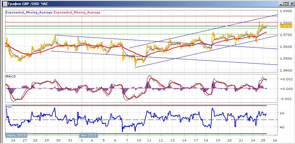 пара продолжает медленно расти с 10 августа в рамках образовавшегося восходящего канала. В пятницу пара закрылась с условным снижением, таки не сумев преодолеть сопротивление на 1.5700. вчера рост продолжился, пара закрылась на 1.5778, протестировав сопротивление на 1.5800. сегодняшние торги проходят с небольшим ростом. Средние скользящие ЕМА55 и ЕМА22 направлены вверх и растут. Индикаторы MACD и RSI вчера вышли выше своих центральных линий и сегодня слабо снижаются. Сегодня цели вверх — 1.5800, 1.5850. Цели вниз — 1.5750, 1.5700