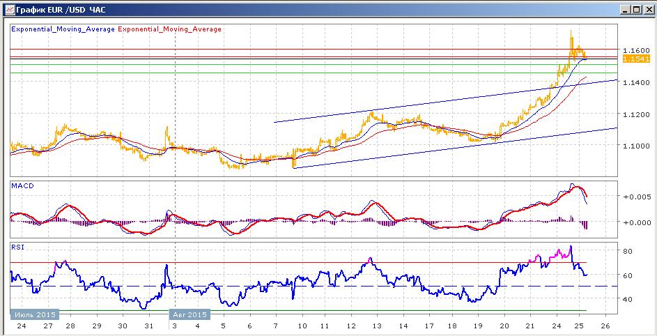 в пятницу пара прибавила около 150 пунктов, закрывшись на 1.1392. вчера рост продолжился, пара закрылась на 1.1619, достигнув уровней середины января этого года. В ходе торгов пара достигла отметки 1.1716. Сегодняшние торги проходят со снижением пары, пара торгуется ниже 1.1550. Средние скользящие ЕМА55 и ЕМА21 направлены вверх и растут. Индикаторы MACD и RSI со среды находятся выше своих центральных линий и сегодня снижаются. Сегодня цели вверх — 1.1550, 1.1600. Цели вниз на сегодня — 1.1500, 1.1450