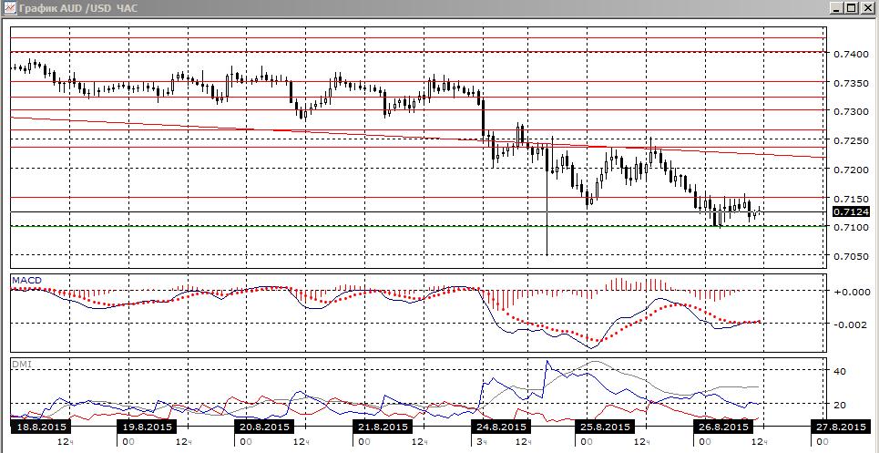 На четырёхчасовом и часовом графиках снижение остаётся сильной тенденцией. Относительные максимумы пары снижаются. Снижение приостановилось выше 0,7100, можно рассматривать консолидацию между 0,7100 и 0,7150. Предпочтительное направление выхода из неё — вниз, в направлении предшествующей тенденции. Целью видится минимум 25 августа на 0,7050.