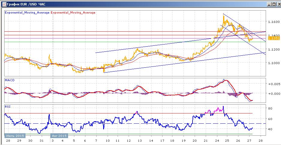 с 24 августа пара снижается, сформировав нисходящий канал. Вчера пара закрылась со снижением на 1.1517, показывая в ходе торгов минимум на 1.1400.вчера снижение было более уверенным, пара потеряла порядка 250 пунктов и закрылась на 1.1315. сегодняшние торги проходят с небольшим ростом пары, торгующейся на данный момент чуть выше 1.1350. Средние скользящие ЕМА55 и ЕМА21 пересеклись вниз и начали снижение. Индикаторы MACD и RSI со вторника находятся ниже своих центральных линий и сегодня слабо растут. Сегодня цели вверх — 1.1400, 1.1450. Цели вниз на сегодня — 1.1350, 1.1300
