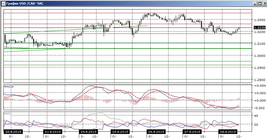 На четырёхчасовом графике произошёл разворот, повторное тестирование уровня 1,3350 не было успешным и там образовалась двойная вершина. По индикаторам направленного движения тенденцией стало снижение: DM- выше DM+, гистограмма MACD в отрицательной зоне, линия MACD имеет отрицательный наклон. Поддержка на 1,3180 сильная, и не стоит рассчитывать на снижение пары до закрепления ниже этого уровня.