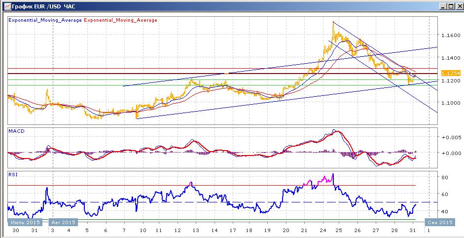 с 24 августа пара снижается, сформировав нисходящий канал. В четверг пара закрылась на 1.1250, достигнув в ходе торгов 1.1201. в пятницу после небольшого роста в начале сессии пара снова перешла в снижение, закрывшись уже ниже 1.1200. сегодняшние торги проходят с ростом пары, торгующейся на данный момент выше 1.1250. Средние скользящие ЕМА55 и ЕМА21 пересеклись вниз и снижаются. Индикаторы MACD и RSI со вторника находятся ниже своих центральных линий и сегодня слабо растут. Сегодня цели вверх — 1.1250, 1.1300. Цели вниз на сегодня — 1.1200, 1.1150