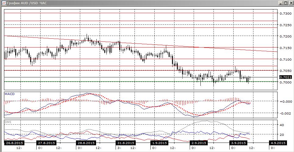 На четырёхчасовом графике — период консолидации в границах 0,7000-0,7050 после снижения от 0,7150. Тенденция снижения не изменилась, и оно остаётся предпочтительным — однако до закрепления ниже 0,7000 рассчитывать на снижение не стоит, так как риск отскока от важного с психологической точки зрения высок. В этом масштабе также имеется бычье расхождение минимумов пары и гистограммы MACD. Уровень 0,70 много раз тестировался в среду и начало четверга, однако видно, что попытки снижения выкупаются.