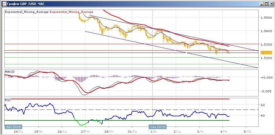 с 27 августа пара продолжает свое снижение в рамках нисходящего канала. Среда прошла в торговле вокруг уровня 1.5300, пара в середине торгов уходила ниже него, но закрылась все же на 1.5301. вчера поддержку на 1.53000 пара преодолела в начале торгов, показала минимум на 1.5218 и закрылась на 1.5258. сегодняшние торги также проходят со снижением пары. Средние скользящие ЕМА55 и ЕМА22 направлены вниз и снижаются. Индикаторы MACD и RSI с прошлого вторника находятся ниже своих центральных линий и сегодня слабо снижаются. Сегодня цели вверх — 1.5250, 1.5300. Цели вниз — 1.5200, 1.5150