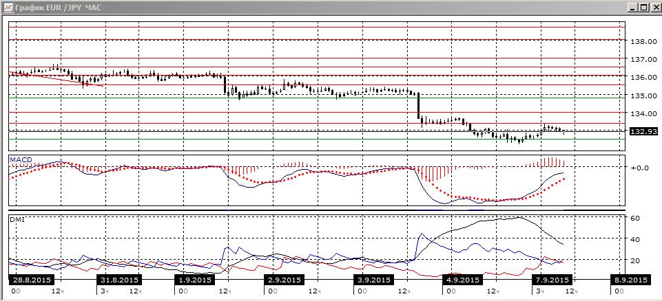 На дневном графике закрытие в пятницу было ниже минимумов июля и мая. Это открывает дорогу к дальнейшему снижению, с целью около 130,00 (около этого уровня была торговля в марте-начале апреля). По индикаторам направленного движения тенденцией остаётся снижение — DM- выше DM+, ADX растёт, гистограмма MACD снижается в отрицательной зоне, линия MACD имеет отрицательный наклон. Тенденция сильная, наклон графика вниз увеличился. Даже при коррекционных движениях вверх, если они будут, снижение остается предпочтительным.