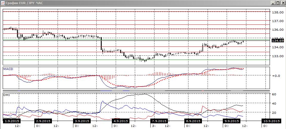 На четырёхчасовом графике пара перешла к росту, относительные минимумы и максимумы пары растут, DM+ выше DM-, гистограмма MACD находится в положительной зоне, линия MACD имеет положительный наклон. Сопротивление при росте было на 133,40, далее задержка около 134,00 была короче. Достигнутый сейчас уровень 134,75 был уровнем поддержки для пары 1-3 сентября, потому здесь можно ожидать сопротивления, и более сильного — на 135,50. Скорее, в данной ситуации надо искать момент завершения коррекции и перехода к снижению. На часовом графике пара также растёт, однако рост замедляется — новые максимумы не подтверждаются по гистограмме MACD.