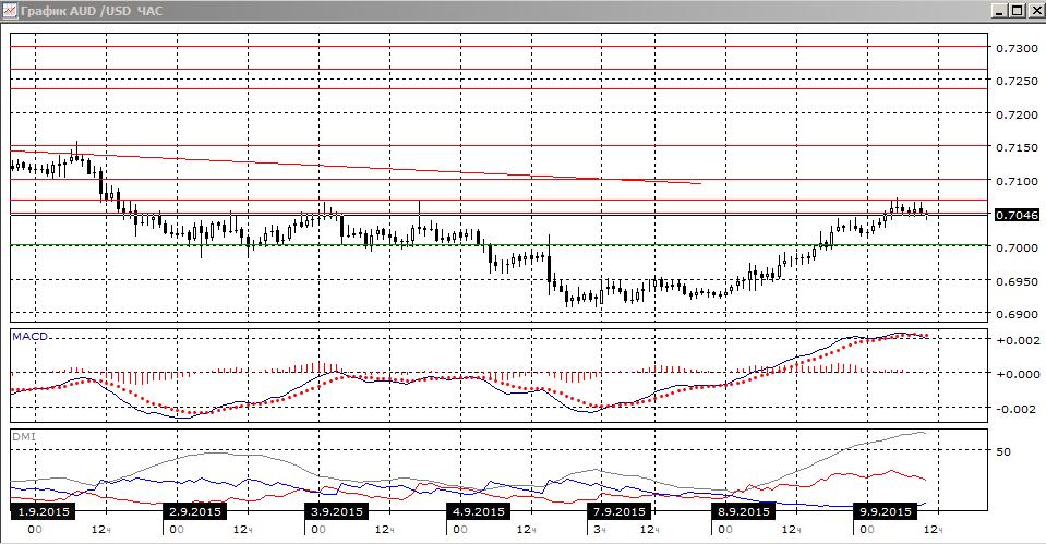 На четырёхчасовом графике пара перешла к росту. Свидетельством силы роста можно рассматривать преодоление уровня 0,7000 без задержки. Сейчас пара на максимумах диапазона пары при консолидации выше 0,7000, текущий уровень сопротивления — на 0,7070. По индикаторам направленного движения пара перешла к росту: DM+ теперь выше DM-, гистограмма MACD растёт в положительной зоне, линия MACD направлена вверх. Сопротивление на 0,7100, скорее, будет сильнее: там рядом и обоснованный уровень поддержки конца августа, и линия нисходящего тренда. В краткосрочной перспективе коррекционный рост, вероятно, будет продолжаться.