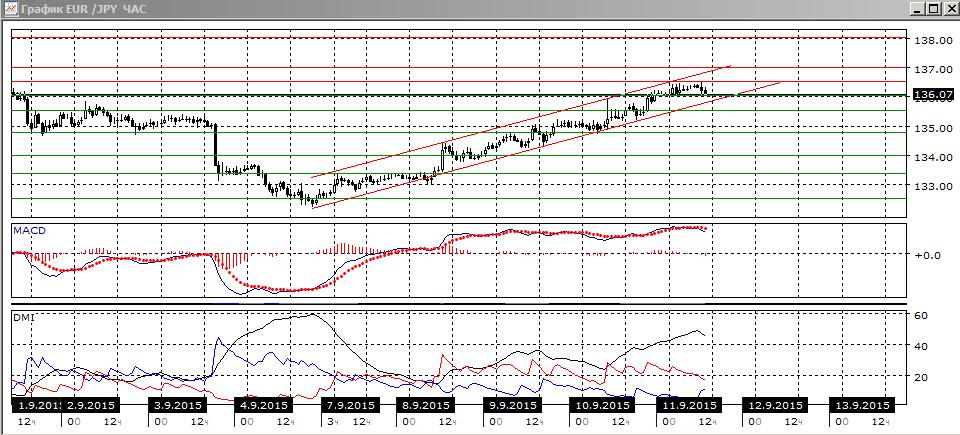 На часовом графике пара растёт в узком восходящем канале. У 136,50 пара встретилась с сопротивлением, и происходит откат к 1,3600. Вероятно, направление краткосрочного движения будет в сторону выхода из краткосрочной консолидации между 136,00 и 136,50.
