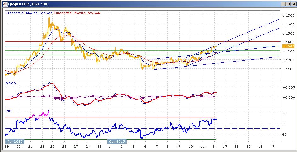 Пара продолжает медленный рост, начатый 4 сентября. Пара двигается в сформировавшемся восходящем канале. В четверг, после кратковременного снижения ниже 1.1200, пара начала расти, закрывшись чуть ниже 1.1300. в пятницу , во второй половине торгов, после неоднократного тестирования 1.1300, пара все же смогла выйти выше 1.1300 и закрыла неделю на уровне 1.1349. сегодняшние торги проходят на уровне открытия, пара тестирует сопротивление 1.1350. Средние скользящие ЕМА55 и ЕМА21 пересеклись вверх и растут. Индикаторы MACD и RSI с четверга находятся выше своих центральных линий и растут. Сегодня цели вверх — 1.1350, 1.1400. Цели вниз на сегодня — 1.1300, 1.1250