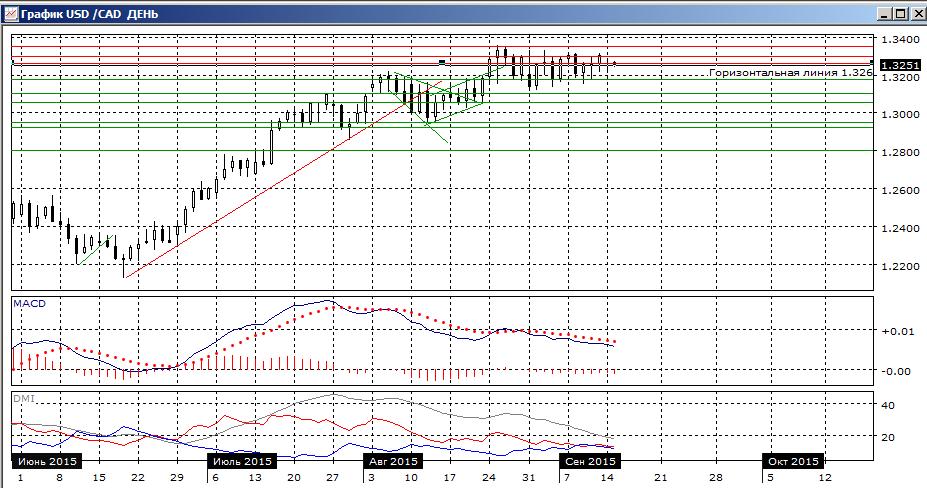 На дневном графике ситуация не изменилась: пара остаётся выше важного уровня поддержки 1,3180, но ниже недавних максимумов на 1,3350. Скорее, это будет продолжаться до завершения заседания ФРС по денежной политике в четверг. Уровни границ канала стали сильными, выйти из консолидации пара должна на сильных новостях. По индикаторам направленного движения также ситуация прежняя: немного боле предпочтительно снижение — гистограмма MACD в отрицательной зоне, линия MACD имеет отрицательный наклон. По ADX тенденции нет, так как DM+ и DM- близки.