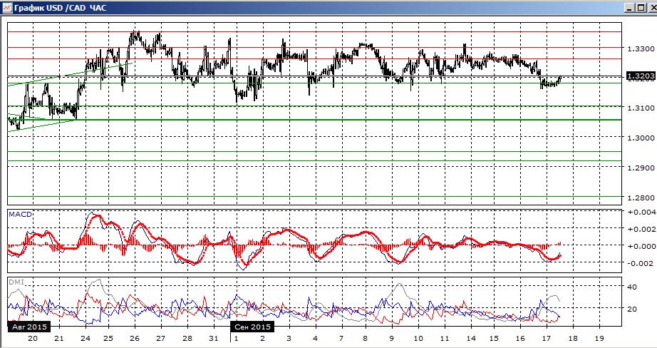 На дневном графике ситуация не изменилась: пара остаётся выше важного уровня поддержки 1,3180, но ниже недавних максимумов на 1,3350. Скорее, это будет продолжаться до завершения заседания ФРС по денежной политике в четверг. Пара снизилась до нижней границы канала, что в рамках движения в канале делает более предпочтительным рост пары. Однако пребывание пары в диапазоне затянулось, и после завершения заседания ФРС пара может выйти из него. Момент сейчас явно не подходящий для торговли в диапазоне. По индикаторам направленного движения также ситуация прежняя: немного боле предпочтительно снижение — гистограмма MACD в отрицательной зоне, линия MACD имеет отрицательный наклон. По ADX тенденции нет, так как DM+ и DM- близки.