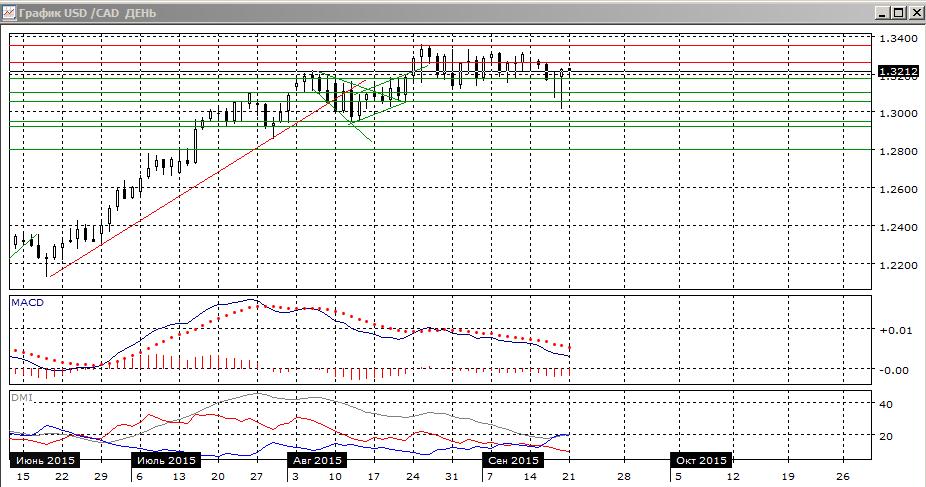 На дневном графике ситуация не изменилась: пара остаётся выше важного уровня поддержки 1,3180, но ниже недавних максимумов на 1,3350, несмотря на два дня попыток выхода ниже, которые закончились хорошо выраженными «молотами». Такая сильная поддержка уровне 1,3180 — скорее, не с пользу снижения, поэтому стоит ожидать роста пары до верхней границы сопротивления 1,3300. По индикаторам направленного движения пара перешла к снижению - гистограмма MACD в отрицательной зоне, линия MACD имеет отрицательный наклон, DM- выше DM+.