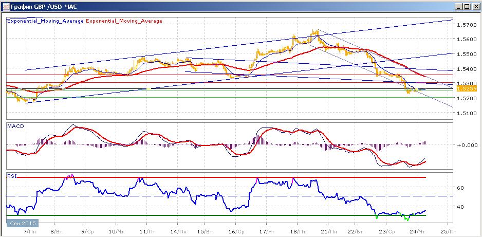 пара прервала свой рост, наблюдавшийся с 7 сентября. Во вторник пара потеряла порядка 150 пунктов, получив поддержку на 1.5350, но при этом выйдя вниз из восходящего канала. Вчера снижение продолжилось, пара потеряла около 100 пунктов, закрывшись чуть ниже 1.5250 — уровня более чем 2-недельного минимума. Сегодняшние торги проходят со слабым ростом пары, торгующейся чуть выше 1.5250. Средние скользящие ЕМА55 и ЕМА22 пересеклись вниз и снижаются. Индикаторы MACD и RSI с пятницы находятся ниже своих центральных линий и сегодня растут. Сегодня цели вверх — 1.5300, 1.5350. Цели вниз — 1.5250, 1.5200