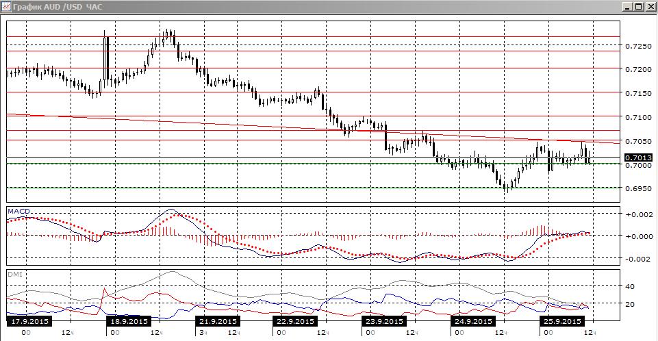 На часовом графике также предпочтительно снижение: коррекция приостановилась, образовалась двойная вершина около 0,7050, долгое тестирование уровня 0,7000 без отскока от него вверх предполагает преодоление уровня поддержки.