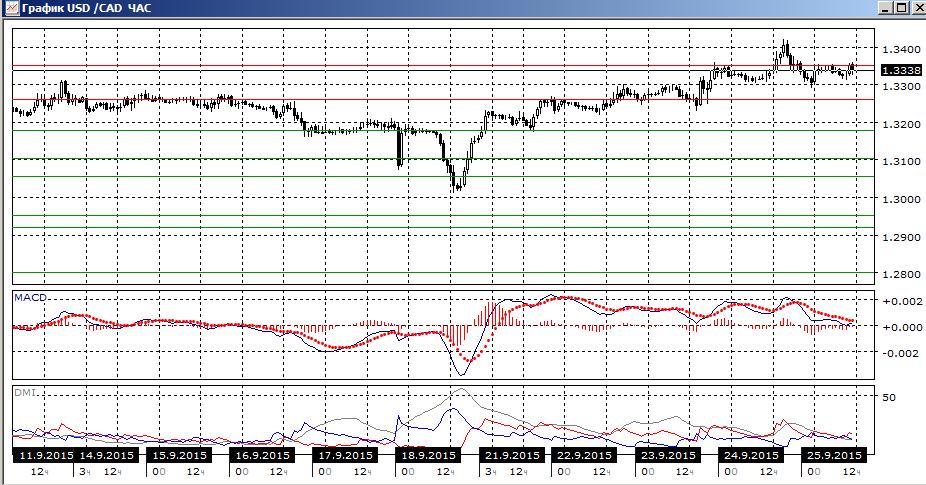 На четырёхчасовом и часовом графиках продолжается тестирование уровня 1,3350: попытка пробоя вверх не была удачной, но и снижения существенно ниже этого уровня пока нет. Выход пары ниже 1,3300 показал бы, что перешла к снижению. 24 сентября около 1,33 было 2 относительных минимума около 1,33. Действовать, скорее, стоит в направлении выхода за пределы 1,3300 — 1,3350.