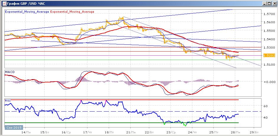 пара продолжает начатое 18 сентября снижение. Четверг закончился почти без изменений, пара торговалась в диапазоне 1.5200-1.5300, в итоге так и закрывшись на 1.5250. в пятницу пара продолжила свое снижение, во второй половине торгов пара преодолела поддержку на 1.5200 и, показав минимум сессии ниже 1.5150, закрылась на 1.5176. сегодняшние торги проходят на уровне открытия, пара слабо колеблется вокруг 1.5200. Средние скользящие ЕМА55 и ЕМА22 направлены вниз и снижаются. Индикаторы MACD и RSI с 21 сентября находятся ниже своих центральных линий и сегодня растут. Сегодня цели вверх — 1.5250, 1.5300. Цели вниз — 1.5200, 1.5150