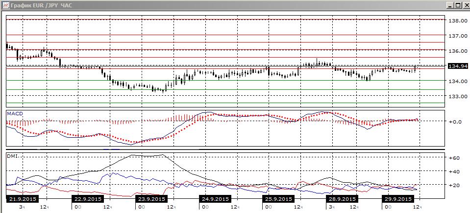 На четырёхчасовом графике, скорее, был разворот вниз с вершиной около 135,50 25 сентября. Последний относительный максимум ниже предыдущего. В рамках движения между определившимися уровнями поддержки 134,00 и сопротивления 134,75 предпочтительно снижение к нижней границе, после того как выхода вверх был неудачным. По индикаторам направленного движения тенденции нет. Похожая картина и на часовом графике: пара во флэте. Консолидация идёт около верхней границы диапазона, но без закрепления выше 134,75 снижение до 134,00 выглядит предпочтительным.