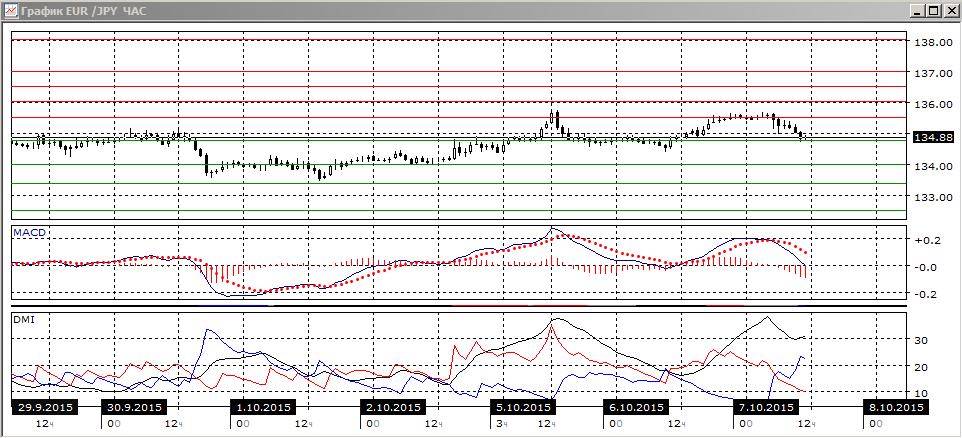 На четырёхчасовом графике пара снижается от 135,50 и находится уже ниже уровня 135,00. Ближайшей целью выглядит теперь уровень поддержки 134,00. По ADX тенденцией остаётся рост — DM+ выше DM-, но два максимума около 135,50 скорее в пользу краткосрочного разворота вниз.